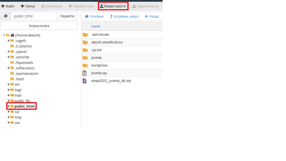 У файловому менеджері натисніть «public_html», щоб перейти до папки, а потім натисніть кнопку «Завантажити».