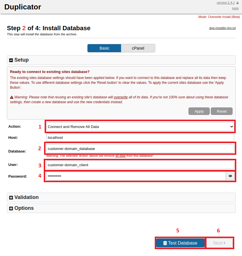 Тепер натисніть «Test Database», щоб виконати перевірку підключення до бази даних (5), а потім натисніть кнопку «Next» (6).
