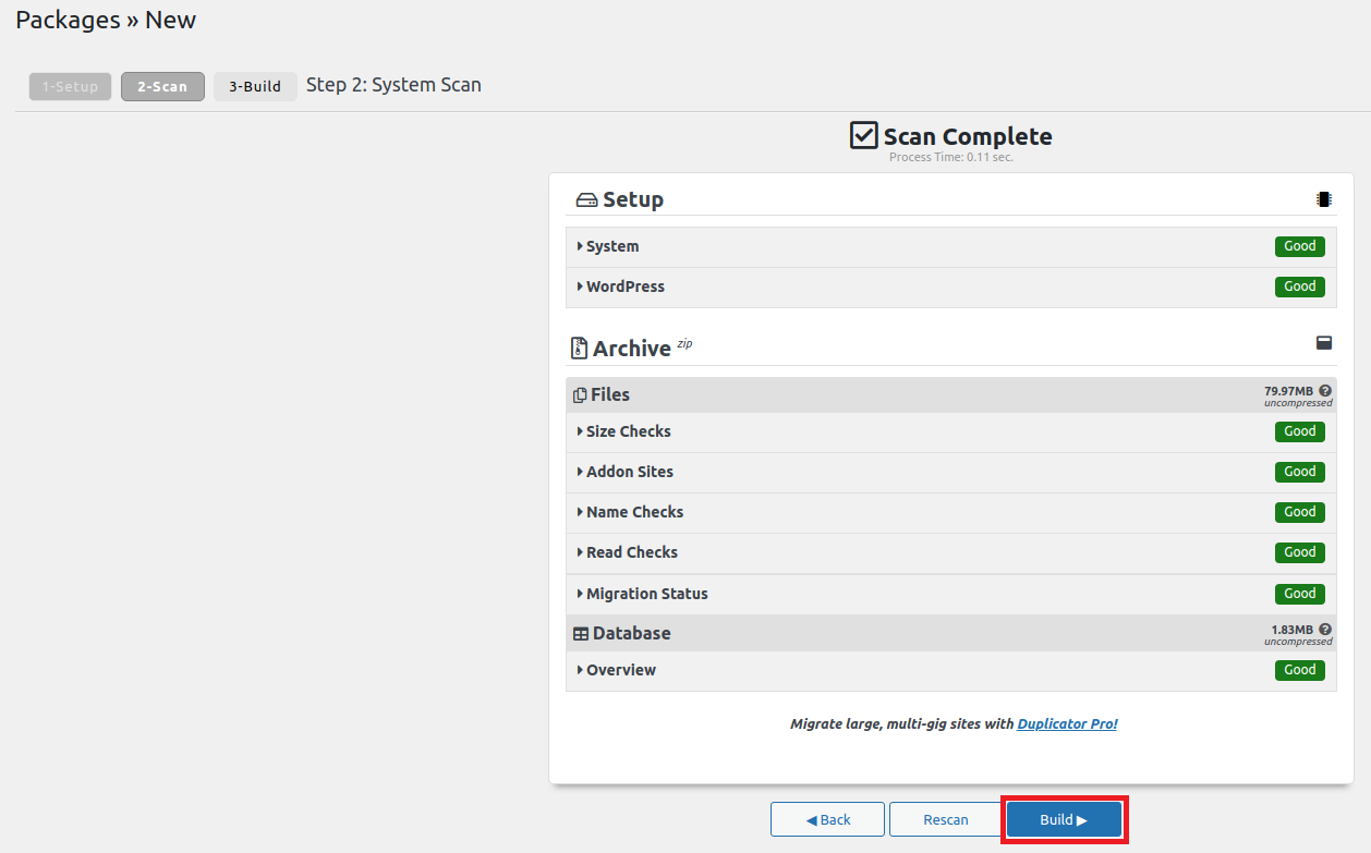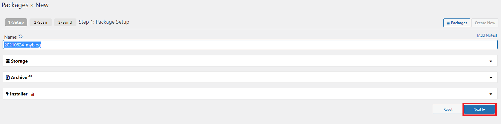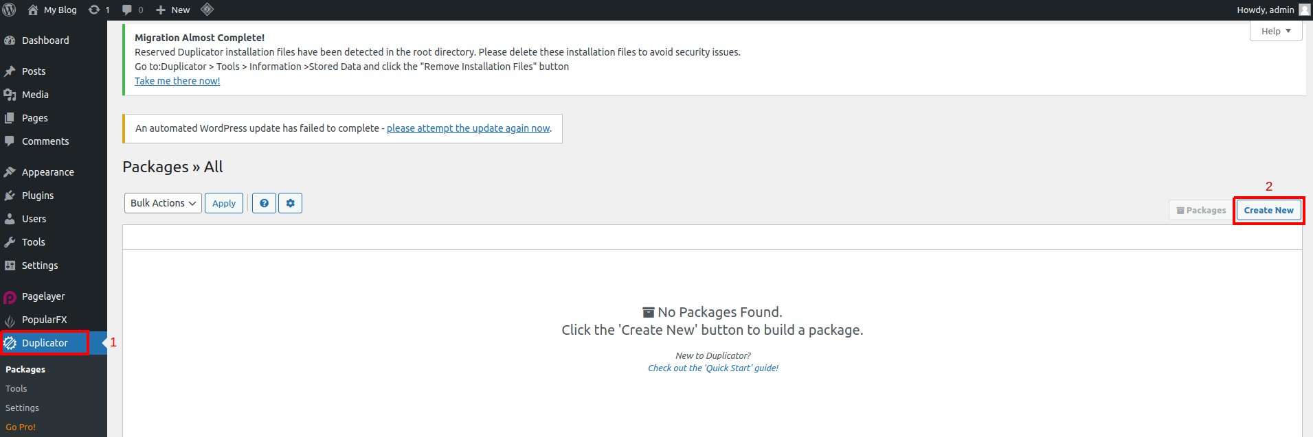 Увійшовши до локально встановленої панелі адміністрування WordPress, натисніть щойно створену кнопку «Duplcator» (1), а потім «Create new» (2). Це відкриє майстер пакетів, який дозволить вам перенести веб-сайт на сервер.