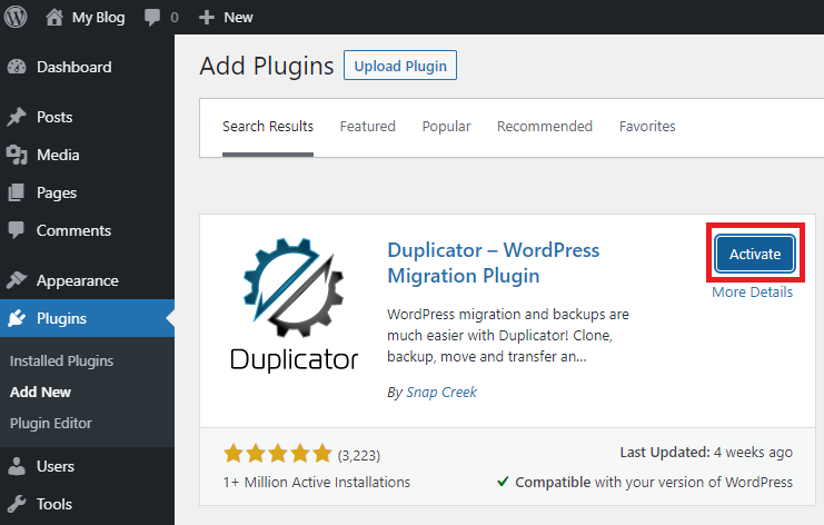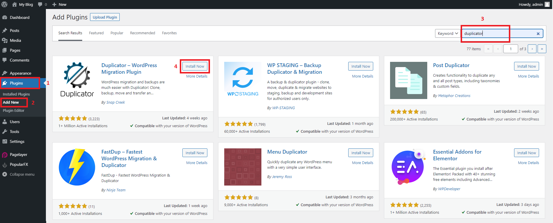 У полі «Пошук плагінів» (3) введіть «duplicator». Це плагін для WordPress, який дозволить вам перенести наш веб-сайт з вашого комп’ютера на сервер. Після пошуку натисніть кнопку «Встановити» (4).