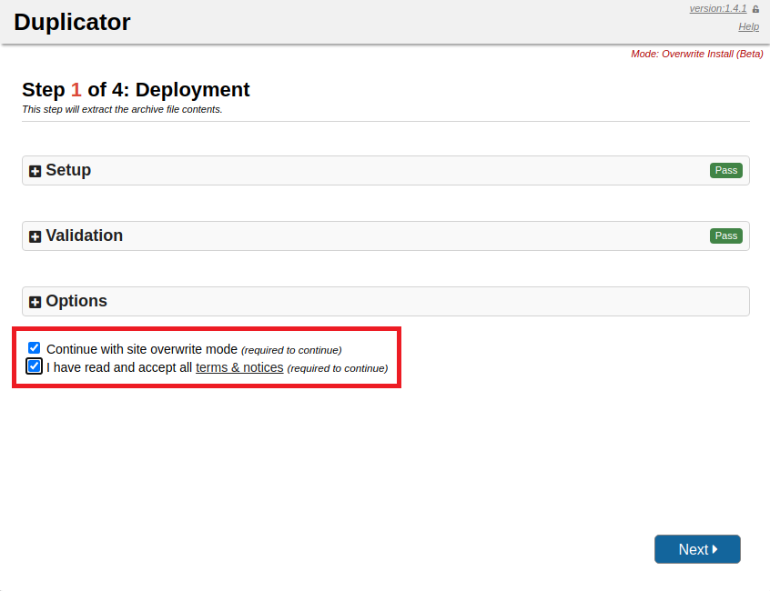 Спочатку виберіть «Connect and Remove All Data» (1), щоб вміст бази даних із локальної версії WordPress було завантажено на сервер до наявної бази даних (це призведе до видалення всього вмісту бази даних, яка існує на сервер).