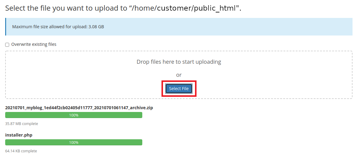 Натисніть кнопку «Select file» і у новому вікні перейдіть до місця, де ви зберегли файл «installer.php» і архів.