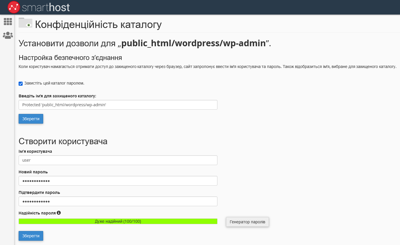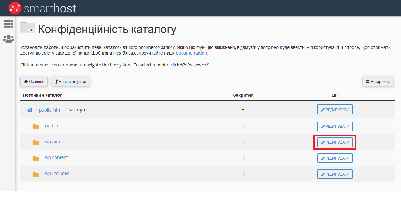 Захистіть вхід до нашої Joomla або WordPress можна за допомогою вбудованого інструменту в cPanel. Наше завдання — захистити каталог wp-admin для WordPress. Для Joomla захищаємо каталог «administrator» так само, як у прикладі нижче.